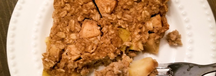 Ingredients: 2 cups old fashioned oats3/4 cup unsweetened vanilla almond milk1 cup unsweetened applesauce½ cup egg whites3 tablespoons Stevia2 teaspoons vanilla extract2 teaspoons cinnamon½ teaspoon baking powder1/4 teaspoon salt2 cups chopped apple Directions: Mix all ingredients in a large mixing bowl. Pour mixture into a large glass casserole dish. Bake in the oven at 350° for 30 minutes. Makes 6 servings.